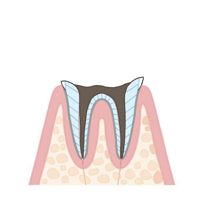 歯の上部(歯冠)がほとんど溶かされて、歯根に達した虫歯です。